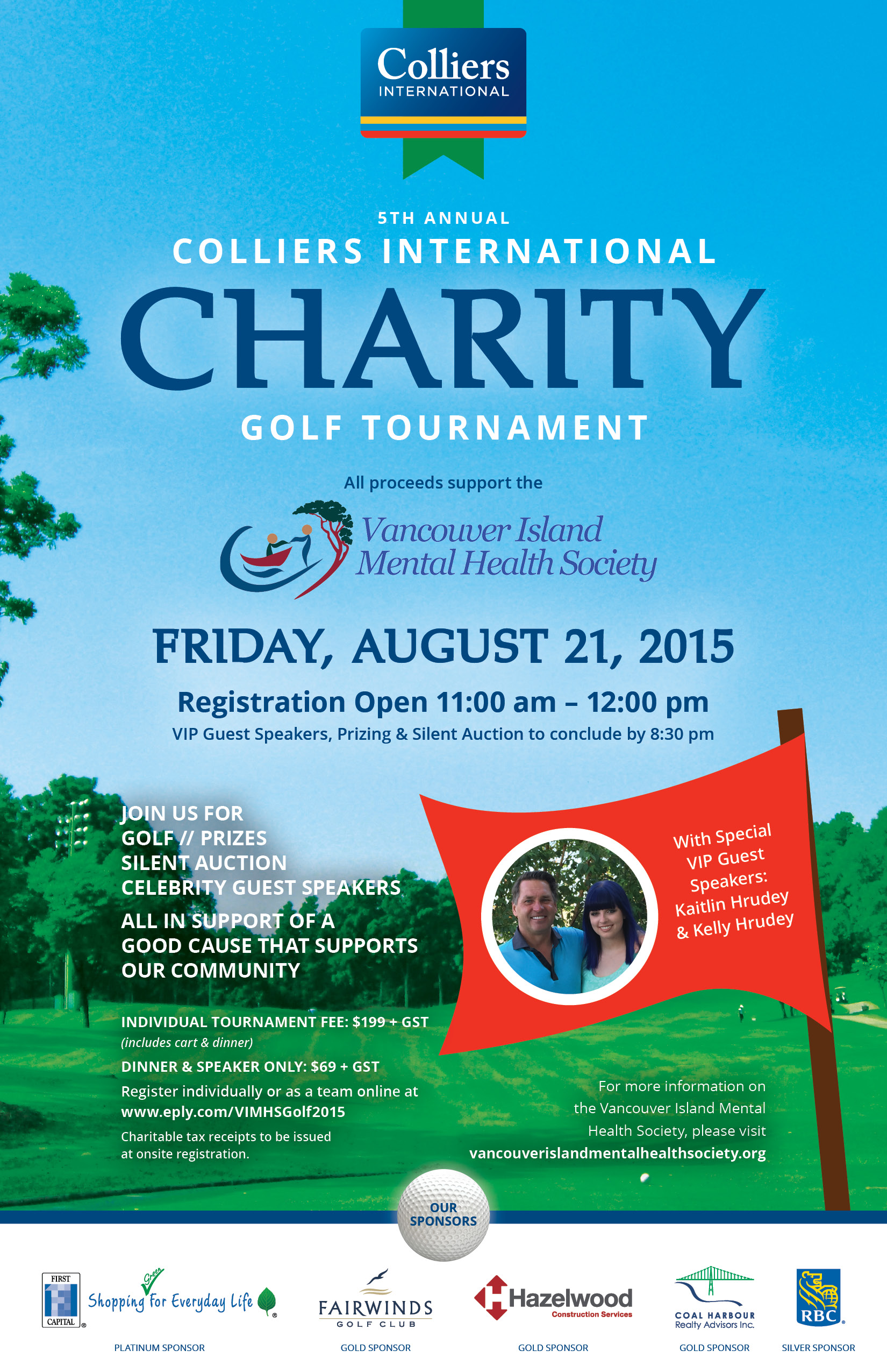 The Vancouver Island Mental Health Society and Colliers International Mid-Island Office are pleased to announce the 5th Annual Charity Golf Tournament. Funds raised at the tournament will be presented to the Vancouver Island Mental Health Society (VIMHS – formerly Columbian Centre Society).